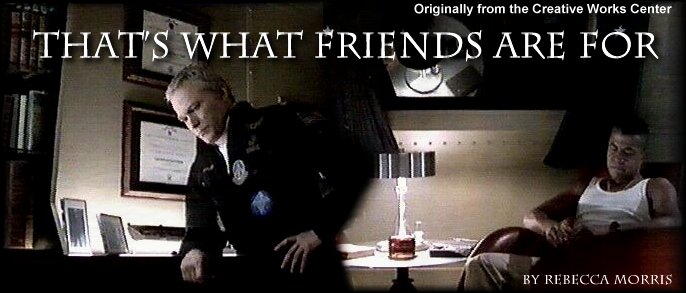That's What Friends are forby Rebecca Morris The bar was as dingy as any. He entered the door, noting the smell of stale alcohol and other intoxicants--some legal, some not. On the ledge under the window lay the carcasses of the flies that had come in through the door that did not quite close. Neon advertising on the walls illuminated the joint dimly. Walking to the far end of the bar, he felt the slight stickiness of a floor never too carefully mopped. The other patrons glanced up as he passed, the stench of hopelessness clingng to them. They lost interest in him and returned to their drinks. When he reached the end of the bar, he sat down, straddling the bar stool. This was not the first bar of this sort he'd been in, but it was the first in a while. "What'll it be?" The bartender passed a cloth over the dirty bar, smearing the stains. "Beer." He looked around while the bartender drew the foaming brew, placing it in front of him, and waiting for the coin or credit. In the world he'd just left, the bartenders would have carried his tab to the end of the evening, but in this one, he knew, they would want proof of solvency before extending any credit. He handed the bartender the currency, pocketed the change, and stared up into the mirror behind the bar. Like everything else here, it was grimy with dust. He barely recognized the face that stared back at him. The silvered hair and deep blue eyes were familiar enough, but he'd lost weight during his stint as a POW, more during the hospital stay. The hollowed cheeks fit well with the despair he felt. The mission that sent him this bar brought home the self doubt and self loathing that he'd been fighting these past two months. A stir in the corner of the room caught his attention as a young woman pleaded with the man that sat before her. "No, Mr. Hill. Not here, not now." The man smiled, a gold tooth glinting in his mouth. Hair black as night was slicked back, gathered in a small queue at the back of his neck. From his flashy dress and entourage, the man at the end of the bar assumed this 'Mr Hill' to be a pimp. Both and the woman seemed slightly out of place. He, because he was clearly natural born, she because she seemed too high class a whore to be here. Her skin had the luminescent quality of a recently decanted IV, only now subjected to the environment. He hair was long and hung in mahogany curls down her back, like some pre-Raphaelite painting. "Yes, Stephanie....here and now." He slid his buttocks forward on the pseudo-leather seat, spreading his legs. Her reluctance clear in the rigidity of her posture as she knelt between his knees, unwilling fingers clumsily fumbling with the fastenings of his trousers. The stranger did not have to see the flesh to know what was happening. Here, in this bar, the young woman was sucking and licking, showing utter obedience to the whim of this man. Mr. Hill's head fell back against the back of the seat. He reached forward and grabbed the woman's head, forcing her to take his rigid cock further into her throat. "Come on, bitch. Do it right. I paid good money for your indentures." His pelvis began to thrust. The stranger turned away, unwilling to watch the spectacle of her debasement. He wasn't surprised that the other patrons ignored it as well. This was "tank town". Here the InVitros who did the dirty work in the city's foundries lived, serving out the indentures that they all owed at birth. His own indentures had been served out on a mining colony, many light years from Earth. In the mines he had learned to serve the whims of natural borns, both as a miner, and for more "personal services". Now he was his own man, a member of an elite force of an elite service. But here he was in a grungy bar in a dirty section of a dirty city to buy the drugs that uncaring physicians had allowed him to become addicted to, listening to a young woman allowing herself to be used. He wondered who was the whore here, just how far had he come, would he ever go. Taking another pull from the beer, he signaled the bartender. "Where can a man find some action?" The bartender continued to wipe the glass he had in his hand, and looked over the newcomer. "You a 'forcer?" The stranger turned his neck to show the bartender the indented navel on the back of his neck, marking him as an IV, a "nipple neck". The bartender nodded. Like almost everyone in this bar, he was an IV himself. The chances of running into an IV law forcer were practically nil. "What kind of action you looking for?" "The green kind." "Green meanies?" At the stranger's nod, the bartender gestured to the man in the corner, now zipping his pants and pushing the prostitute away. "He's your man." Grimacing with distaste, the stranger stood, "He natural born?" "Yeah." The stranger walked over to the corner table and pulled out one of the chairs, straddling it. "I hear you got something I want." The other man smiled again, showing that gold tooth "I'm Mr Hill, and I got something everybody wants. What's your pleasure?" He gestured widely, including the room and the hooker, still kneeling in front of him. "Not that. Phyllophthetamines. That's all." Mr. Hill continued to smile, "What you got to give me in return, my man?" He reached out a hand and started to touch the stranger's face. Like lightening, Mr. Hill found his hand held fast. "I am not 'your man'. I'm not your indentured, or anyone else's. I'm my own man and I've got money. Now...we can have a mutually profitable relationship, or I can go someplace else." He released Hill's hand. The natural born shook it experimentally a couple of times. "Em, fast as well as pretty." He leered at the stranger, "Three for one. That's the deal." The stranger reached in his pocket and pulled out a wad of credits. "Here's a hundred for 40. That's the deal." The drug dealer nodded, "We can do that." He